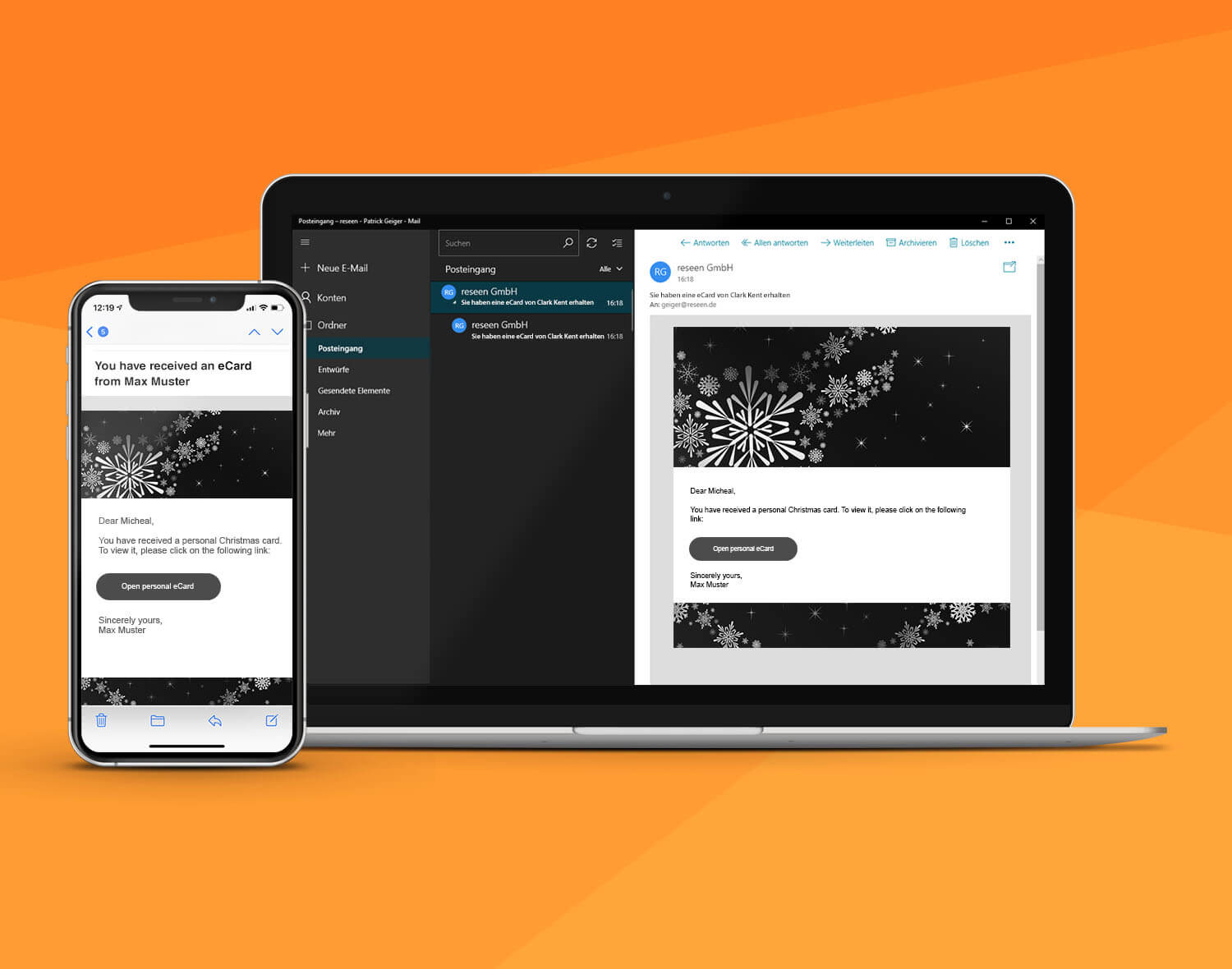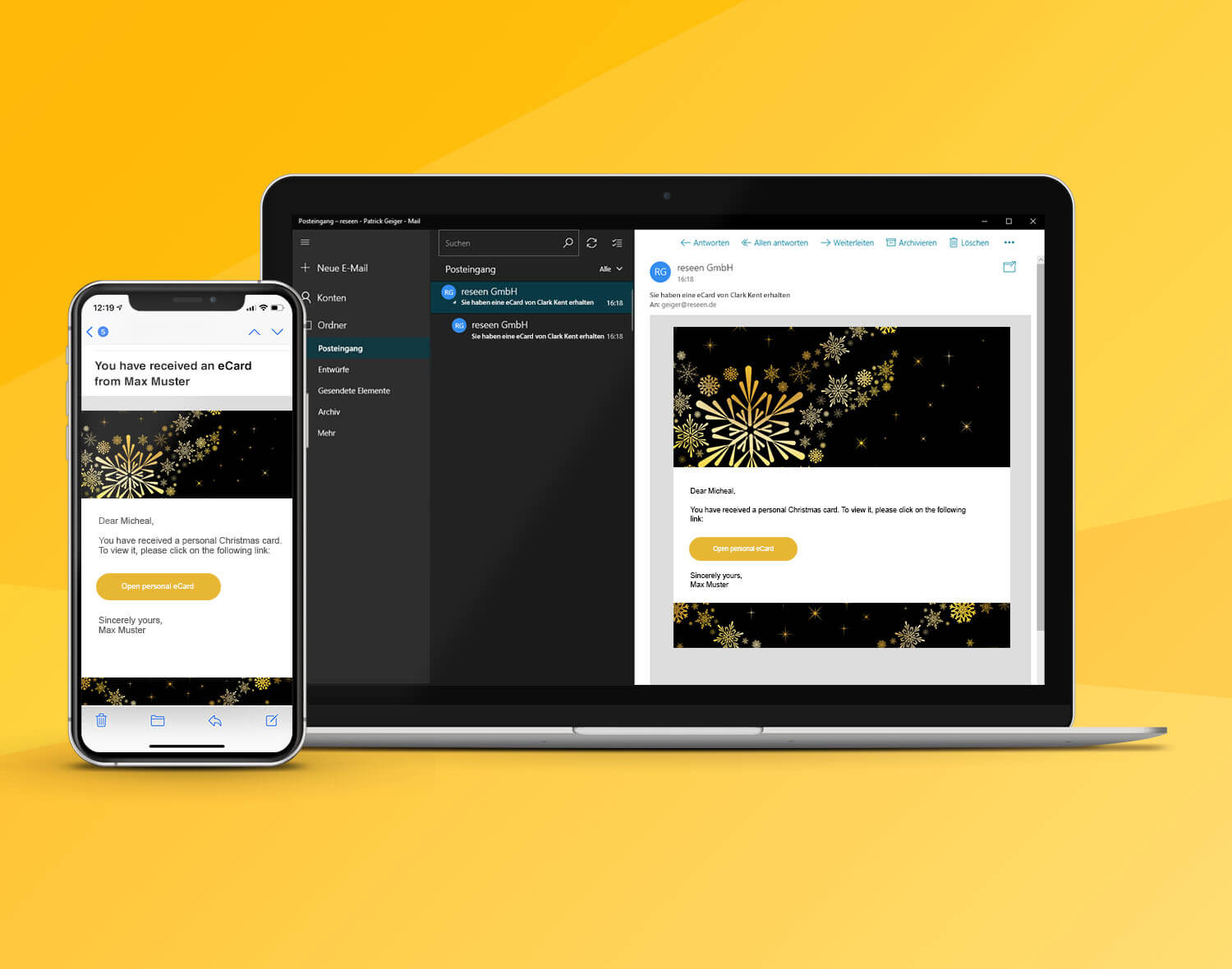 A black background featuring two computer screens displaying a golden design with the text "Design and send your eCard!"